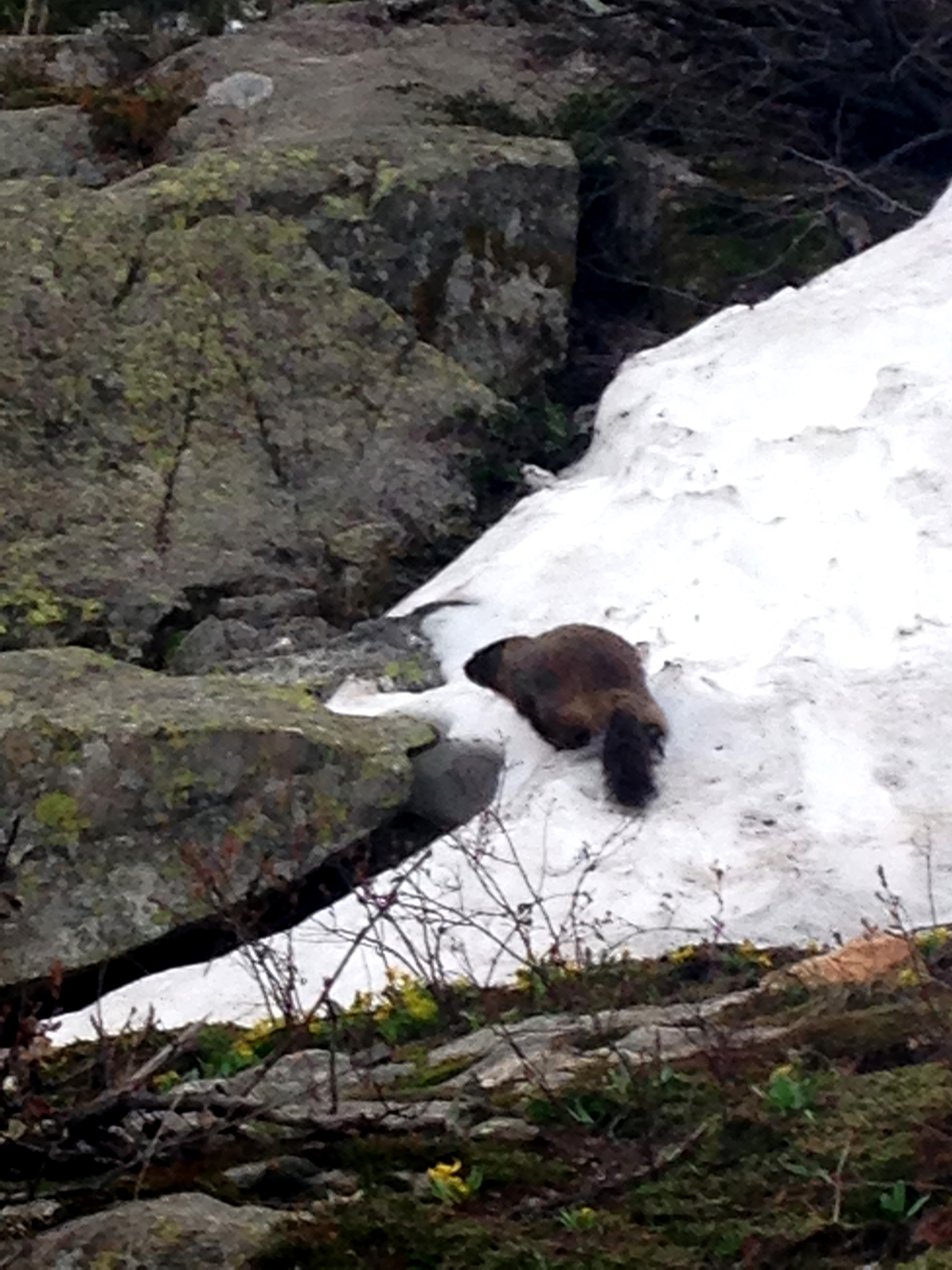 Then we hiked around the lake back to the visitor’s center. The trail was still a bit snowy, but we managed. The weather itself was fine, although we did get some rain. Along the way we also saw some wildlife. Small, non-bear, wildlife. Which is how I like my wildlife.